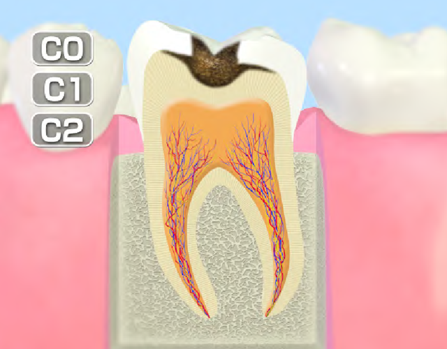 初期のむし歯であれば削る部分も少なく済み、詰め物による最小限の治療で改善します。